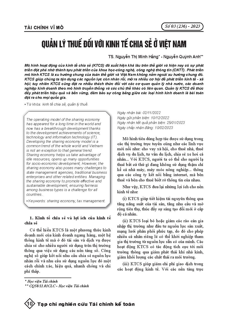 Quản lý thuế đối với kinh tế chia sẻ ở Việt Nam = Tax management for the sharing economy in Vietnam