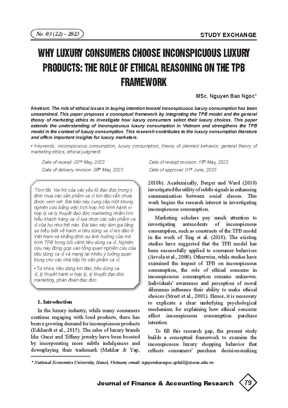 Tại sao khách hàng xa xỉ lựa chọn sản phẩm xa xỉ kín đáo: Vai trò của lý luận đạo đức trong mô hình hành vi hợp lý = Why luxury consumers choose inconspicuous luxury products: The role of ethical reasoning on the TPB framework