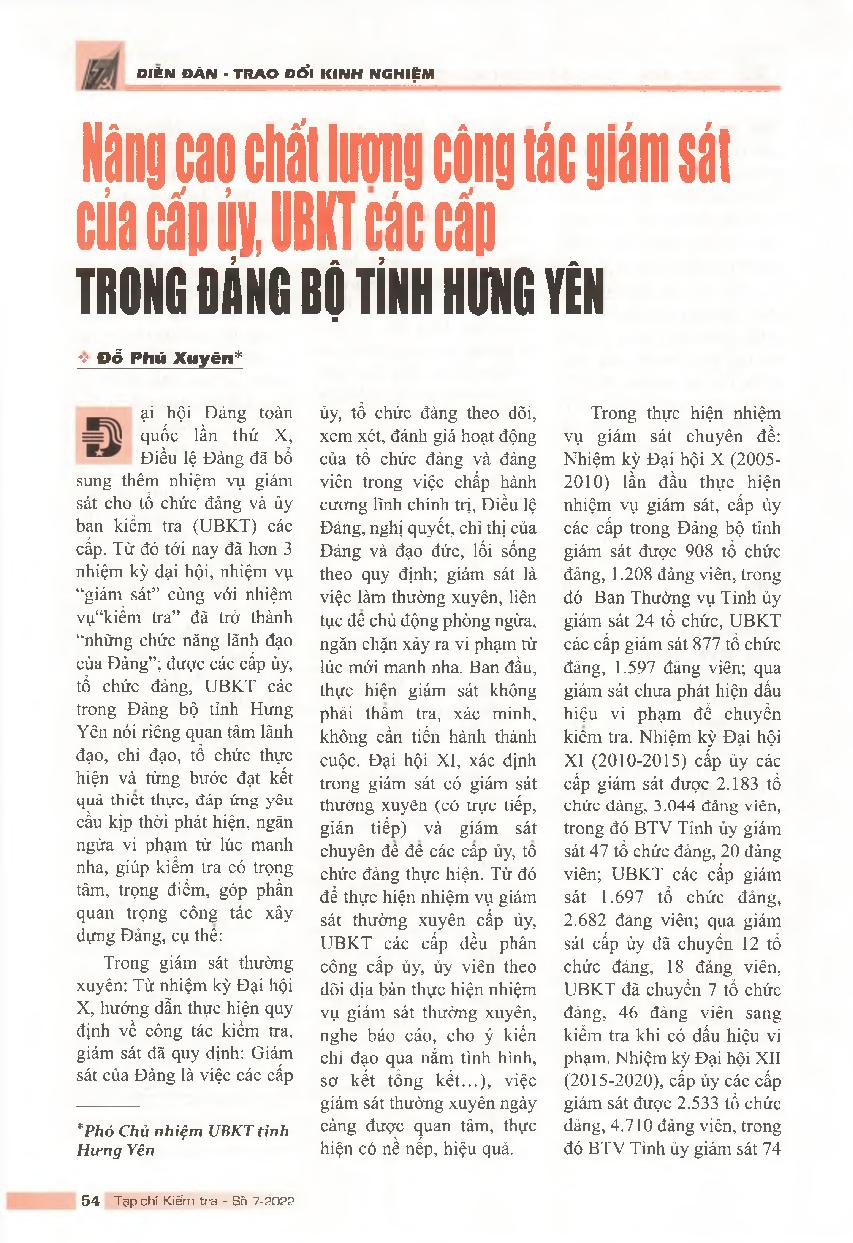 Nâng cao chất lượng công tác giám sát của cấp ủy, UBKT các cấp trong Đảng bộ tỉnh Hưng Yên