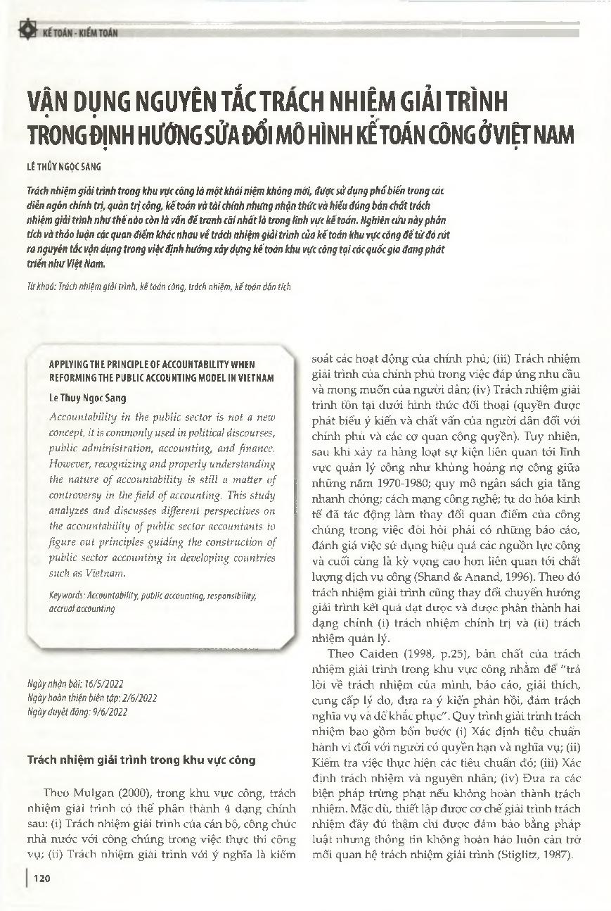 Vận dụng nguyên tắc trách nhiệm giải trình trong định hướng sửa đổi mô hình kế toán công ở Việt Nam = Applying the principle of accountability when reforming the public accounting model in Vietnam