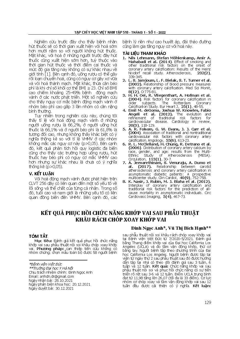 Kết quả phục hồi chức năng khớp vai sau phẫu thuật khâu rách chóp xoay khớp vai = The results of rehabilitation of the shoulder after endoscopic surgery on rotator cup’s rupture