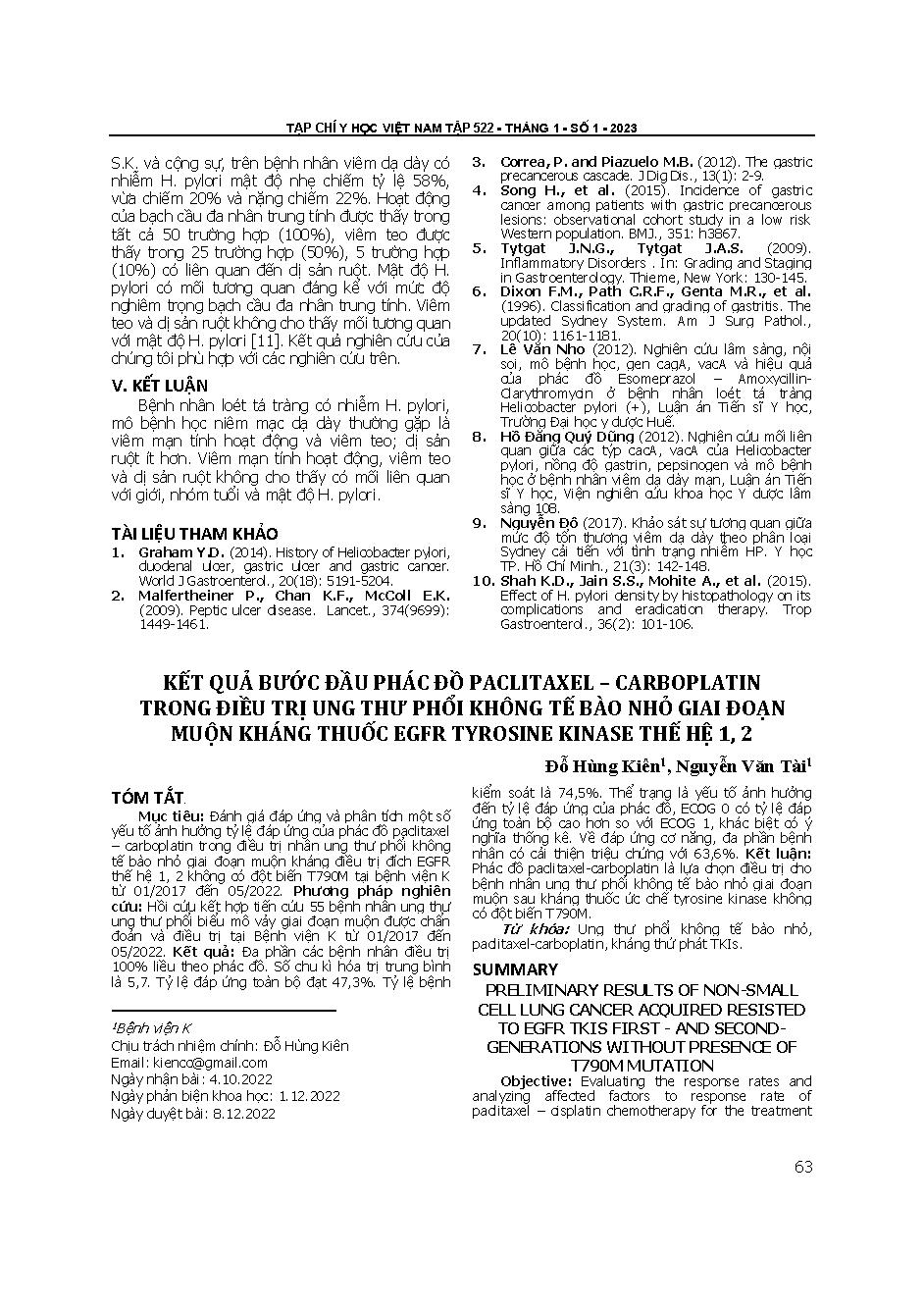 Kết quả bước đầu phác đồ paclitaxel – carboplatin trong điều trị ung thư phổi không tế bào nhỏ giai đoạn muộn kháng thuốc EGFR tyrosine kinase thế hệ 1, 2 = Preliminary results of non-small cell lung cancer acquired resisted to EGFR TKIs first - and secon