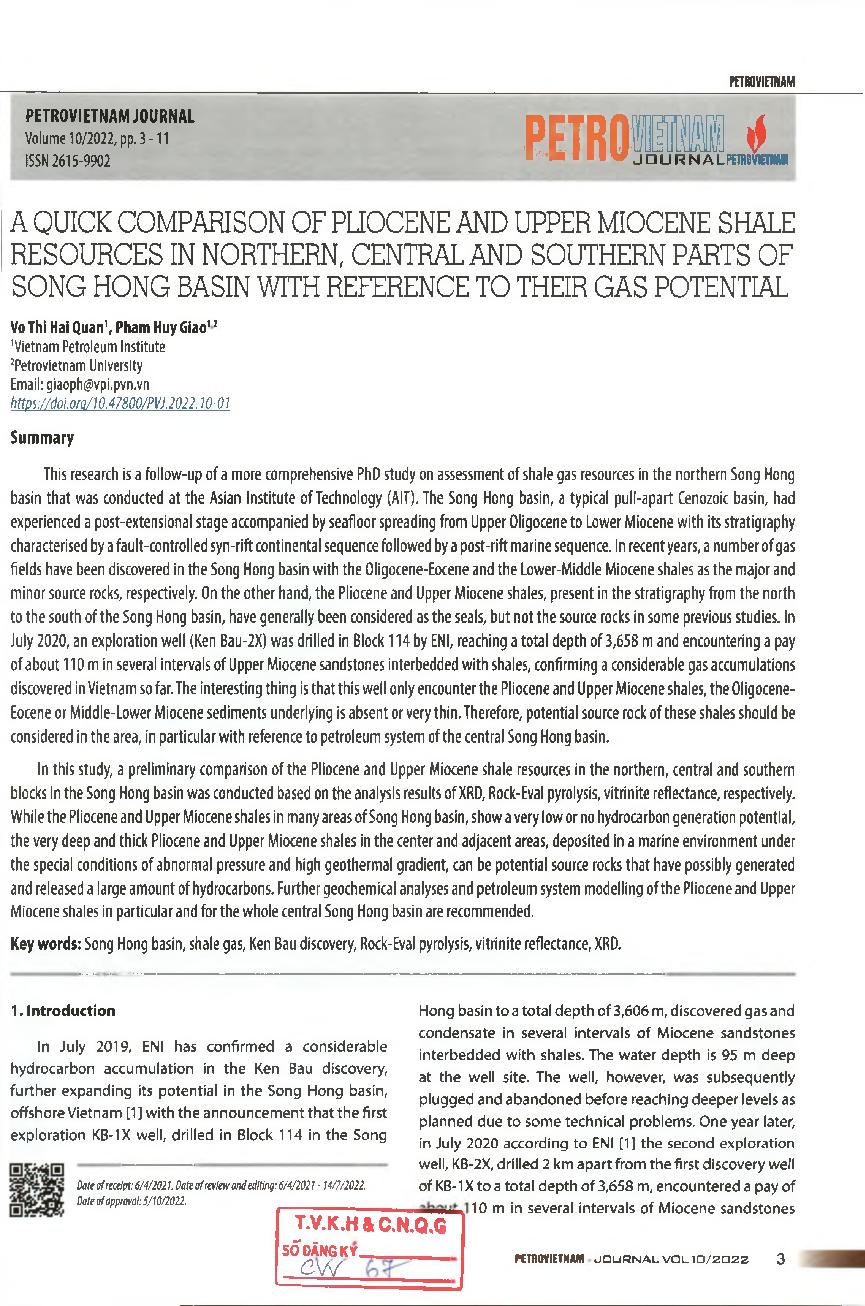 So sánh nhanh tài nguyên đá phiến Pliocen và Miocen thượng ở các phần phía bắc, trung và nam của bể Sông Hồng có liên quan đến tiềm năng khí đốt của chúng = A quick comparison of Pliocene and Upper Miocene shale resources in northern, central and southern