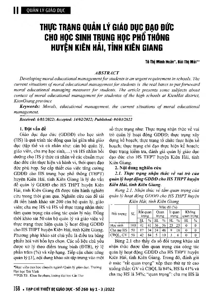 Thực trạng quản lý giáo dục đạo đức cho học sinh trung học phổ thông huyện Kiên Hải, tỉnh Kiên Giang = The current situations of moral educational management for the high school students at Kien Hai district, Kien Giang province