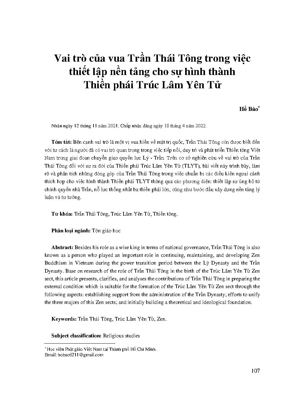 Vai trò của vua Trần Thái Tông trong việc thiết lập nền tảng cho sự hình thành Thiền phái Trúc Lâm Yên Tử = King Trần Thái Tông’s role in establishment of foundation for formation of Trúc Lâm Yên Tử Zen sect