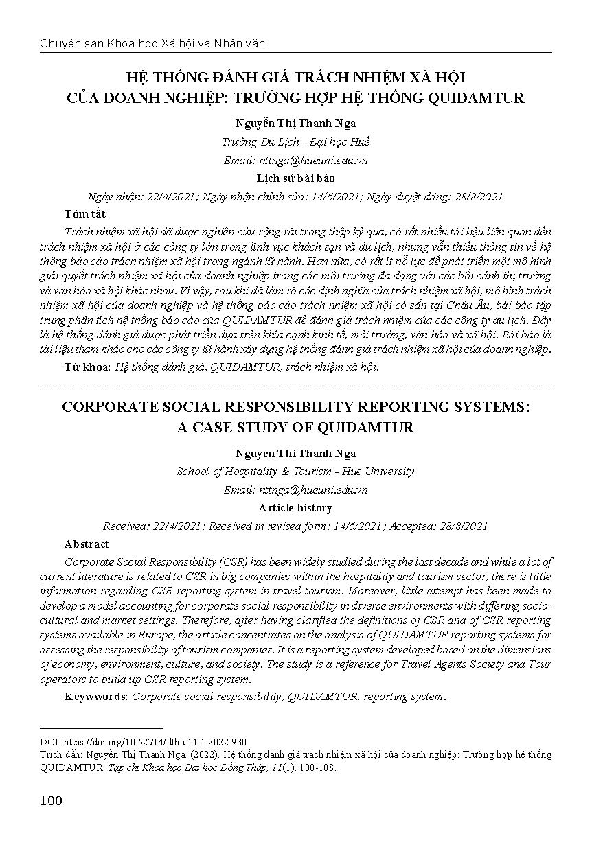 Hệ thống đánh giá trách nhiệm xã hội của doanh nghiệp: Trường hợp hệ thống QUIDAMTUR = Corporate social responsibility reporting systems: a case study of QUIDAMTUR