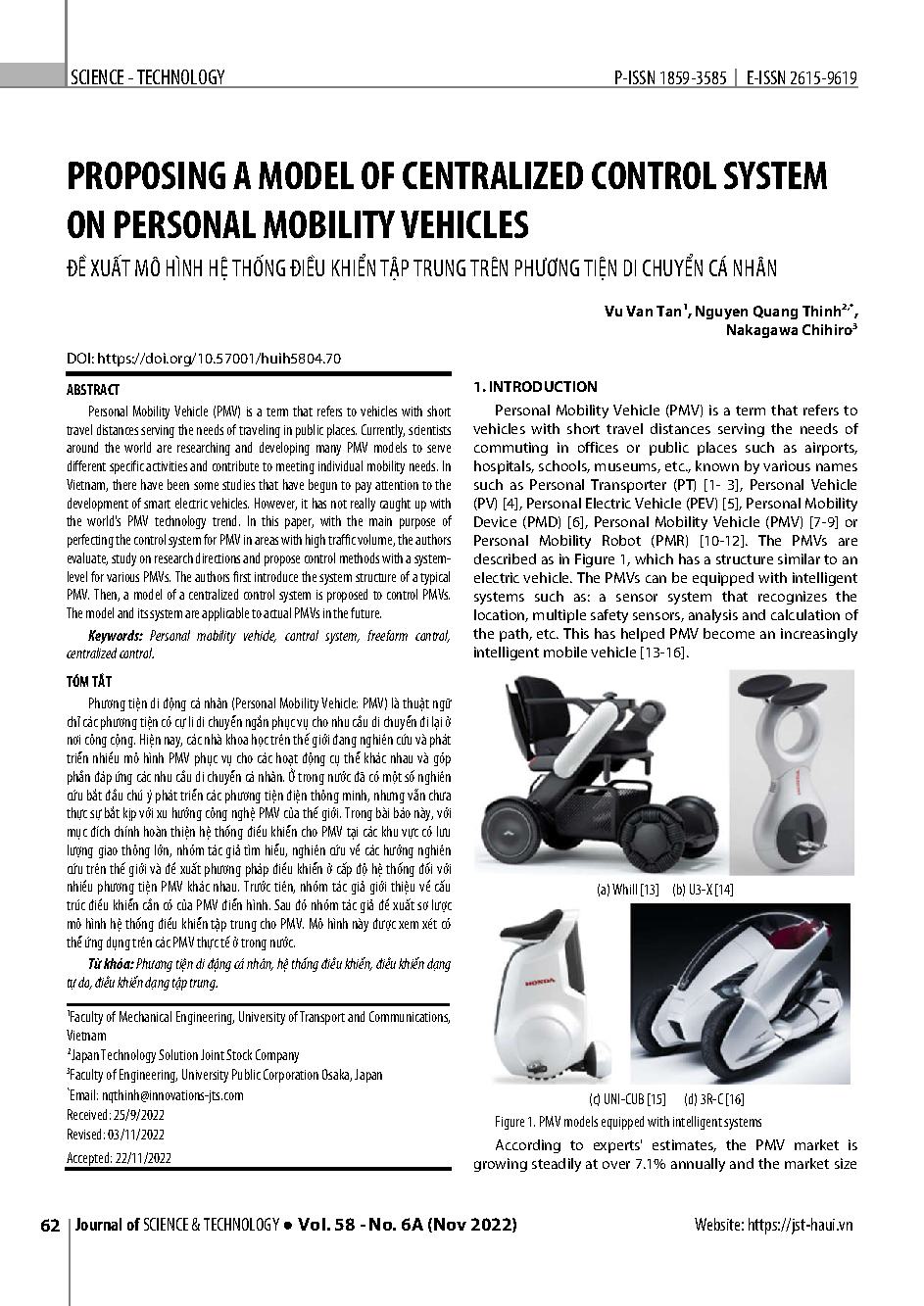 Đề xuất mô hình hệ thống điều khiển tập trung trên phương tiện di chuyển cá nhân = Proposing a model of centralized control system on personal mobility vehicles