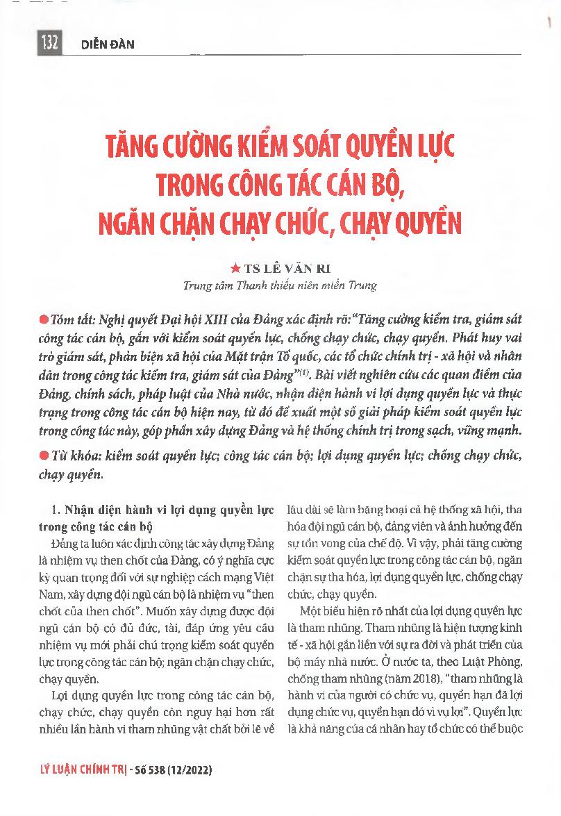 Tăng cường kiểm soát quyền lực trong công tác cán bộ, ngăn chặn chạy chức, chạy quyền = Strengthen control of power in personel work, prevent jockeying for positions of pow