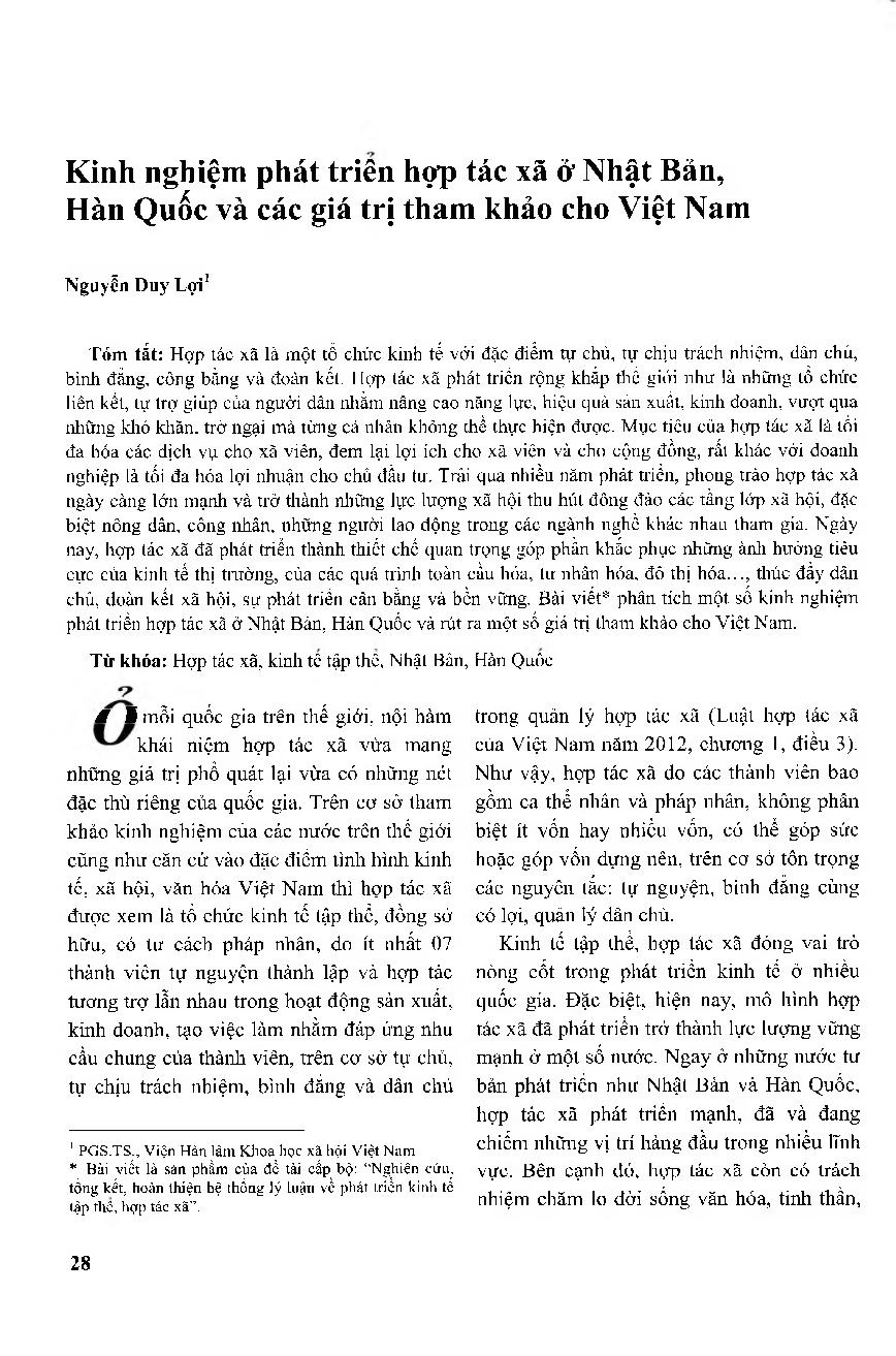Kinh nghiệm phát triển hợp tác xã ở Nhật Bản, Hàn Quốc và các giá trị tham khảo cho Việt Nam = Experience in Developing Cooperatives in Japan, Korea and Reference Values for Vietnam