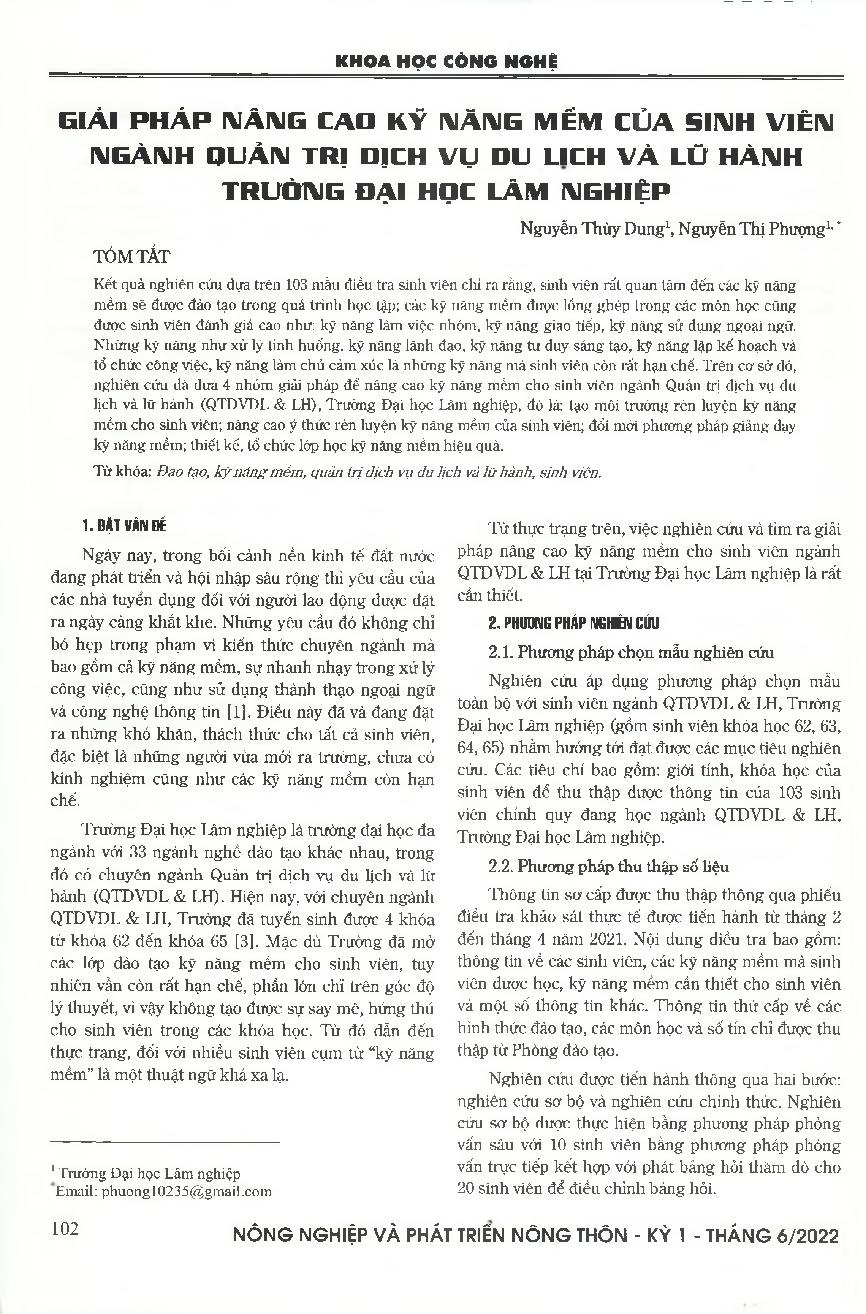 Giải pháp nâng cao kỹ năng mềm của sinh viên ngành quản trị dịch vụ du lịch và lữ hành Trường Đại học Lâm nghiệp = Solutions for improving students’ soft skills in tourism and travel service management at Vietnam National University of Forestry