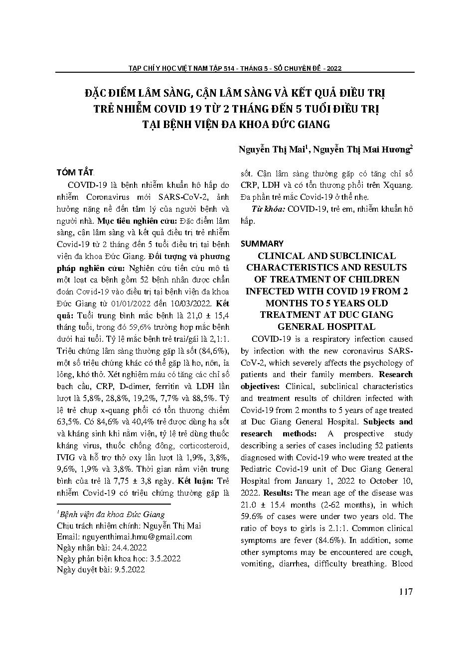 Đặc điểm lâm sàng, cận lâm sàng và kết quả điều trị trẻ nhiễm Covid 19 từ 2 tháng đến 5 tuổi điều trị tại Bệnh viện Đa khoa Đức Giang = Clinical and subclinical characteristics and results of treatment of children infected with Covid 19 from 2 months to 5