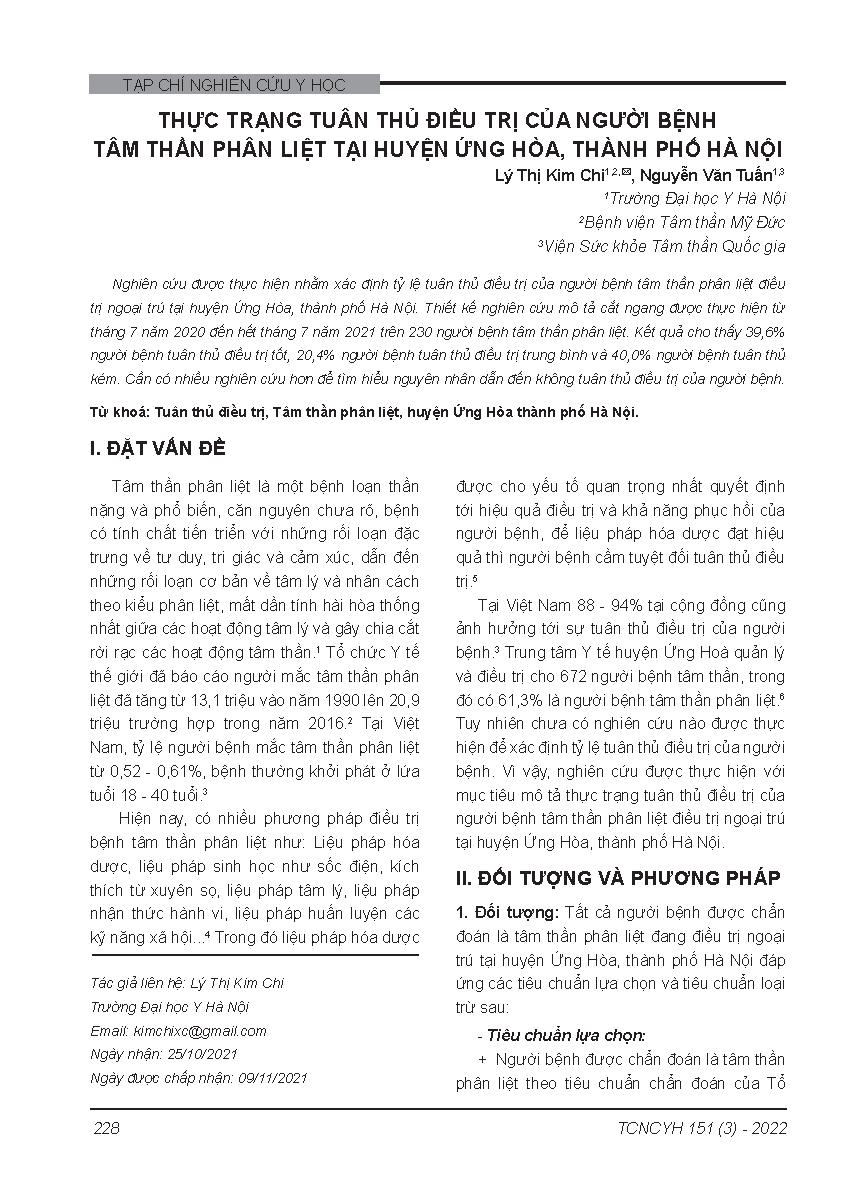 Thực trạng tuân thủ điều trị của người bệnh tâm thần phân liệt tại huyện Ứng Hòa, thành phố Hà Nội