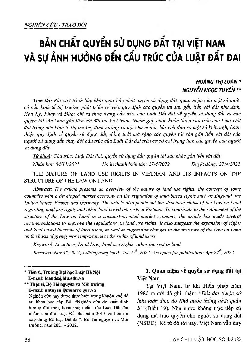 Bản chất quyền sử dụng đất tại Việt Nam và sự ảnh hưởng đến cấu trúc của Luật Đất đai = The nature of land use rights in Vietnam and its impacts on the structure of the Law on land