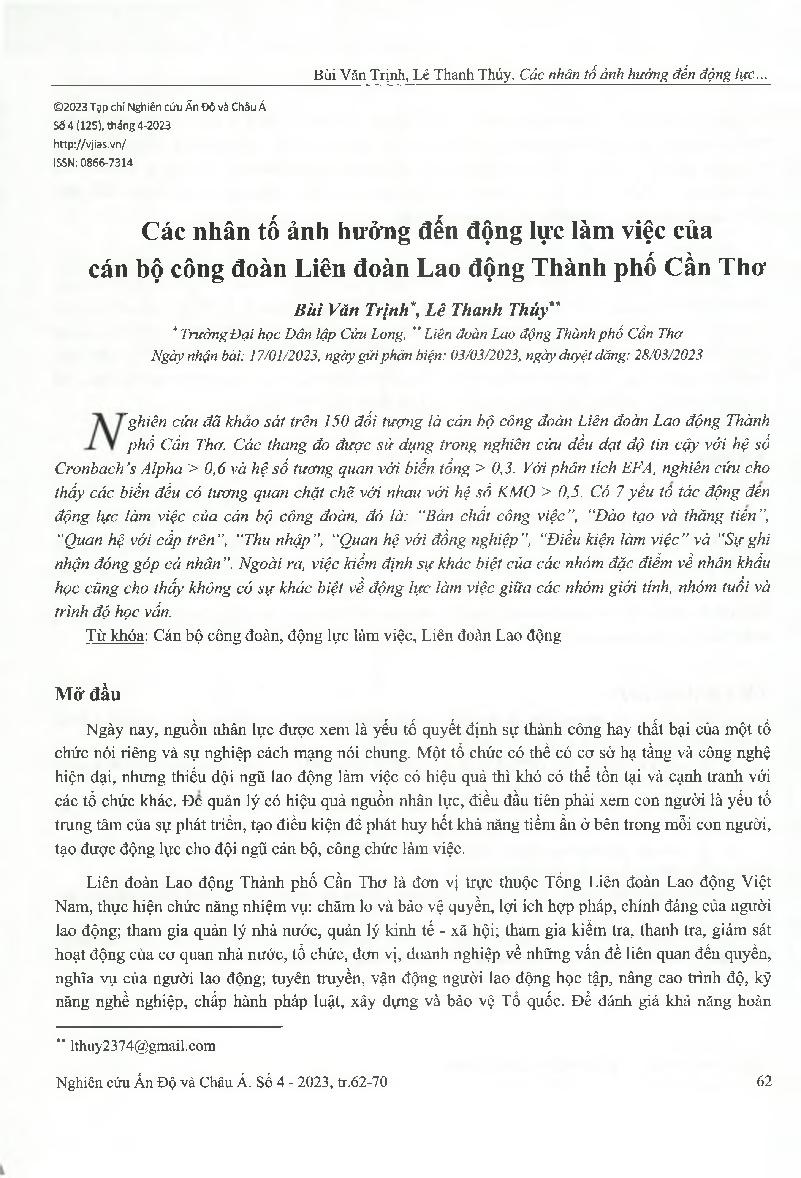 Các nhân tố ảnh hưởng đến động lực làm việc của cán bộ công đoàn Liên đoàn Lao động Thành phố Cần Thơ