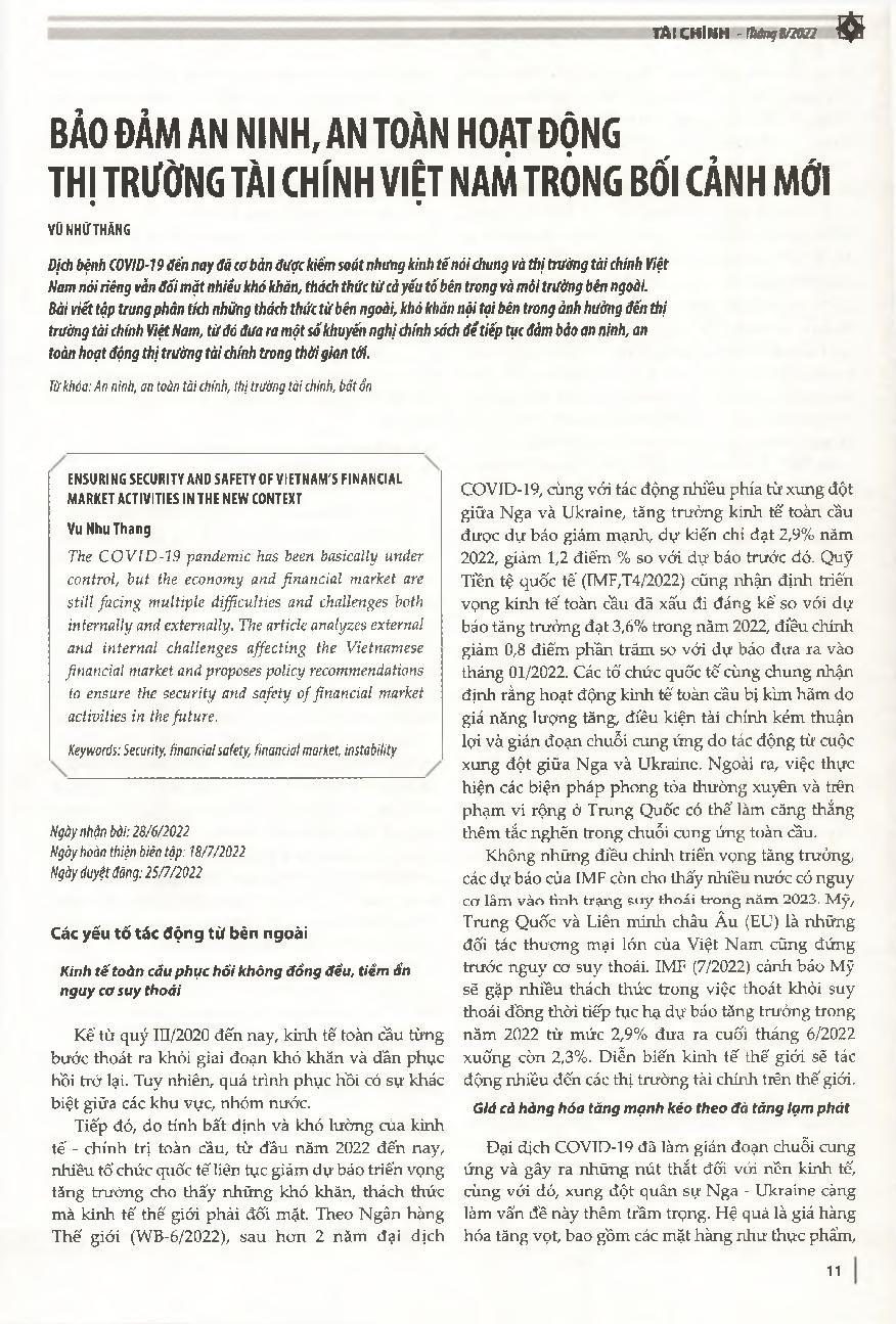 Bảo đảm an ninh, an toàn hoạt động thị trường tài chính Việt Nam trong bối cảnh mới = Ensuring security and safety ofVietnam&; 39;s financial market activities in the new context