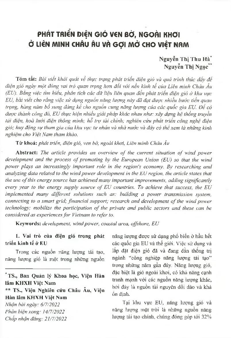 Phát triển điện gió ven bờ, ngoài khơi ở, Liên minh Châu Âu và gợi mở cho Việt Nam = Coastal and offshore wind power development in the European Union and suggestions for Vietnam