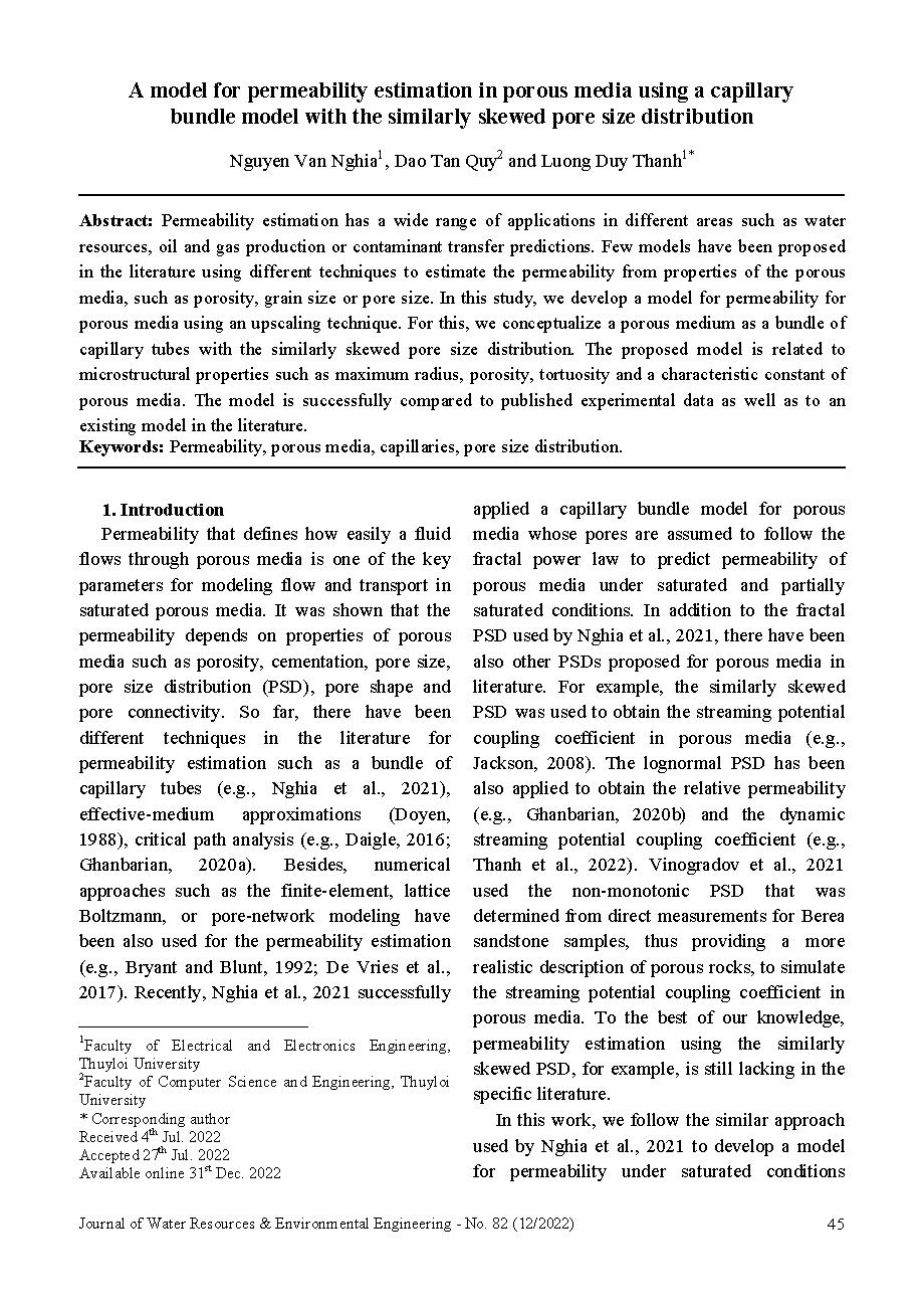 Một mô hình ước tính tính thấm trong môi trường xốp sử dụng mô hình bó mao quản với sự phân bố kích thước lỗ xốp tương tự = A model for permeability estimation in porous media using a capillary bundle model with the similarly skewed pore size distribution