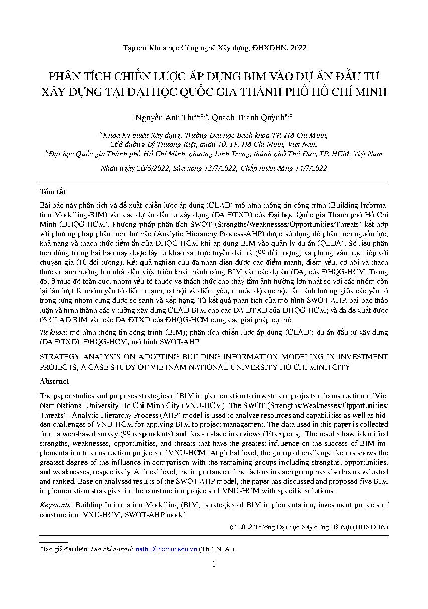 Phân tích chiến lược áp dụng bim vào dự án đầu tư xây dựng tại đại học quốc gia thành phố Hồ Chí Minh = Strategy analysis on adopting building information modeling in investment projects, a case study of vietnam national university Ho Chi Minh city