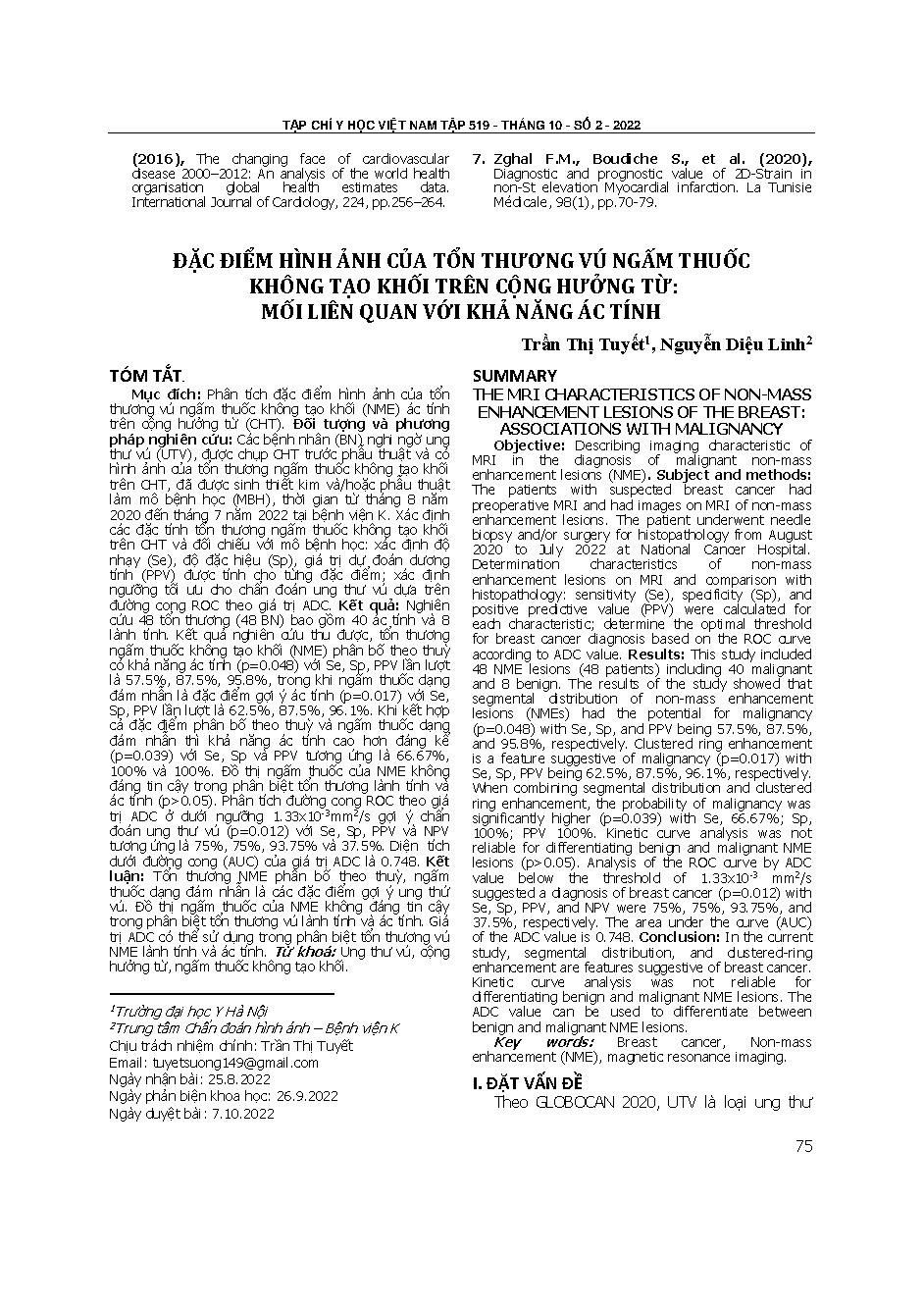 Đặc điểm hình ảnh của tổn thương vú ngấm thuốc không tạo khối trên cộng hưởng từ: Mối liên quan với khả năng ác tính = The MRI characteristics of non-mass enhancement lesions of the breast: Associations with malignancy