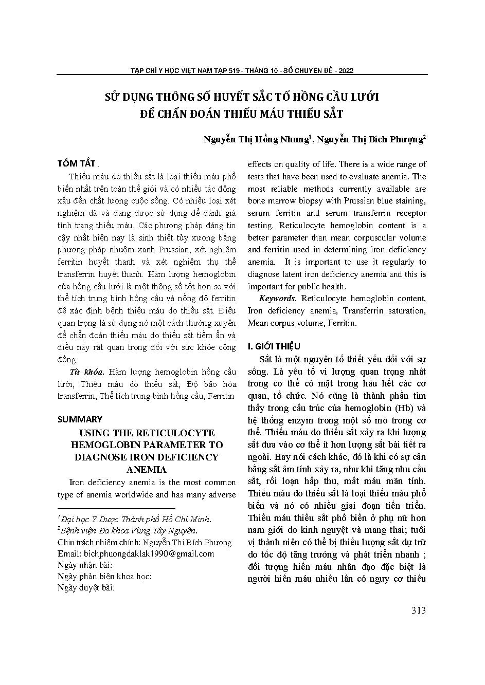 Sử dụng thông số huyết sắc tố hồng cầu lưới để chẩn đoán thiếu máu thiếu sắt = Using the reticulocyte hemoglobin parameter to diagnose iron deficiency anemia