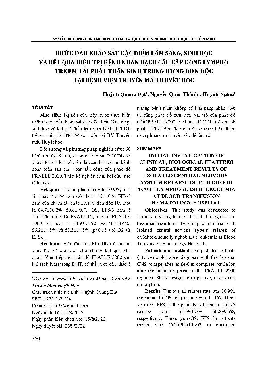 Bước đầu khảo sát đặc điểm lâm sàng, sinh học và kết quả điều trị bệnh nhân bạch cầu cấp dòng lympho trẻ em tái phát thần kinh trung ương đơn độc tại Bệnh viện Truyền máu Huyết học = Initial investigation of clinical, biological features and treatment res