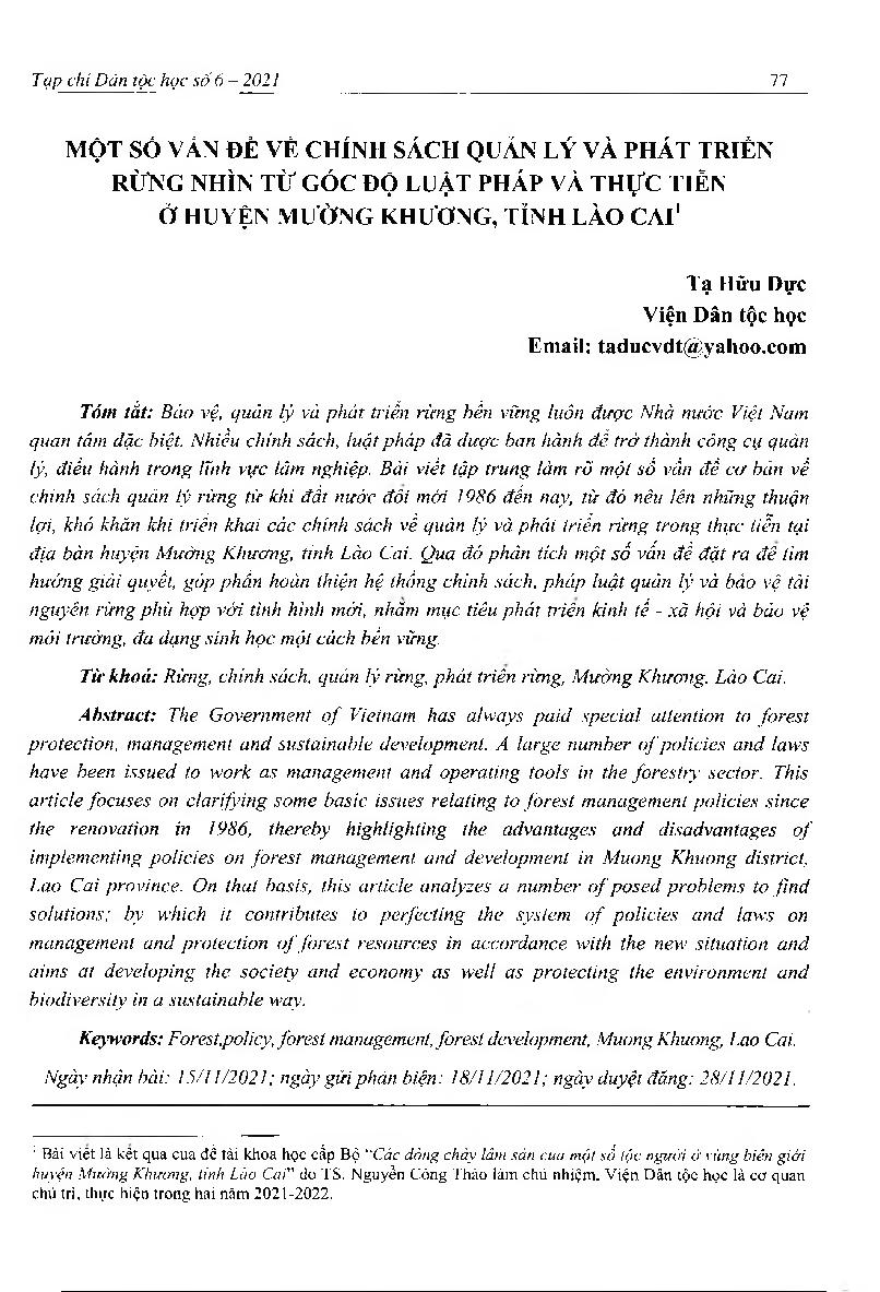 Một số vấn đề về chính sách quản lý và phát triển rừng nhìn từ góc độ luật pháp và thực tiễn ở huyện Mường Khương, tỉnh Lào Cai = Some issues of forest management and development policy from the perspective of law and practice in Muong Khuong district, Lao Cai province