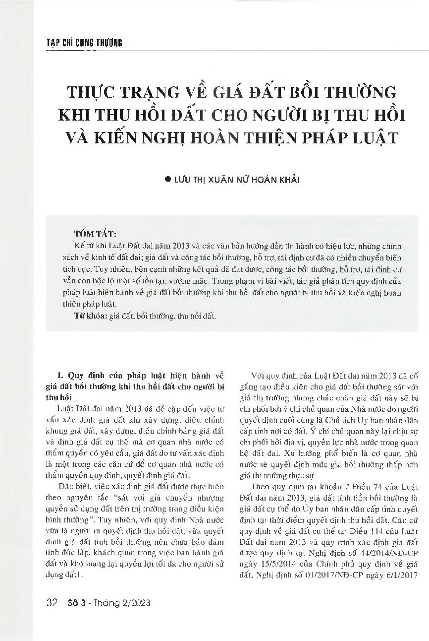 Thực trạng về giá đất bồi thường khi thu hồi đất cho người bị thu hồi và kiến nghị hoàn thiện pháp luật = An analysis of legal provisions of current land prices for calculating compensation for land acquisition and some recommendations to improve these pr