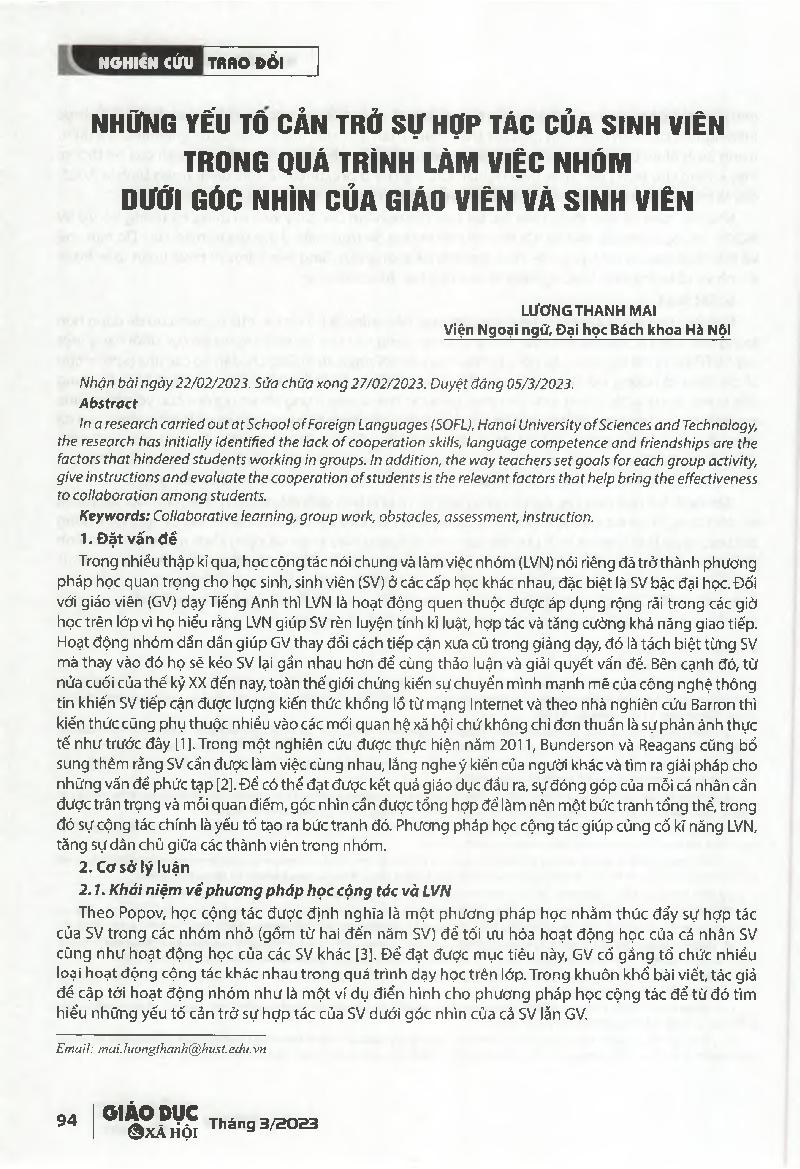 Những yếu tố cản trở sự hợp tác của sinh viên trong quá trình làm việc nhóm dưới góc nhìn của giáo viên và sinh viên = Teacher and student perceived obstacles to students' collaboration in group work.