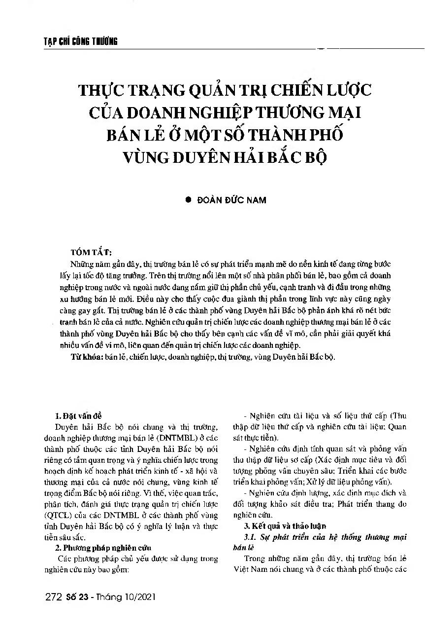Thực trạng quản trị chiến lược của doanh nghiệp thương mại bán lẻ ở một số thành phố vùng Duyên hải Bắc bộ = The current strategic management of some retailers in cities of the Northeast Coast Region