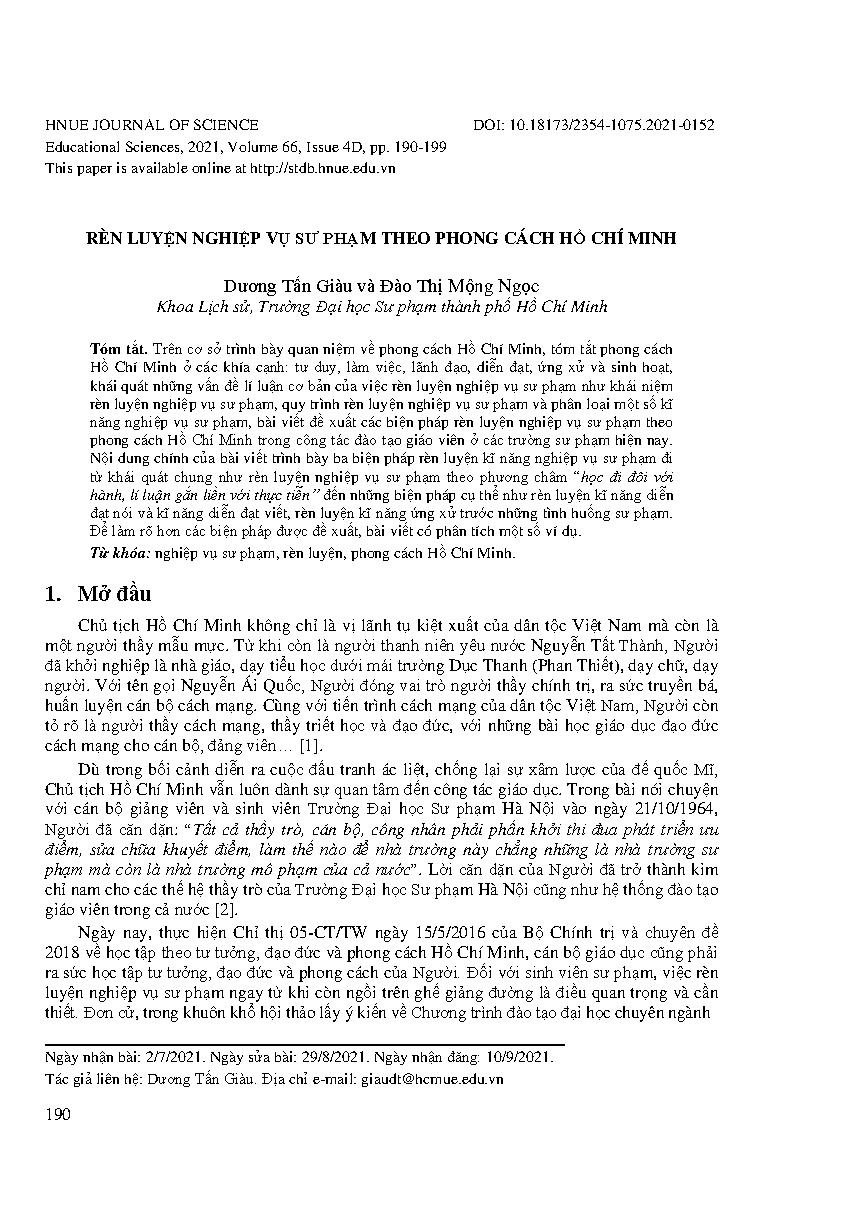 Rèn luyện nghiệp vụ sư phạm theo phong cách Hồ Chí Minh = Practicing pedagogical skills according to Ho Chi Minh's style