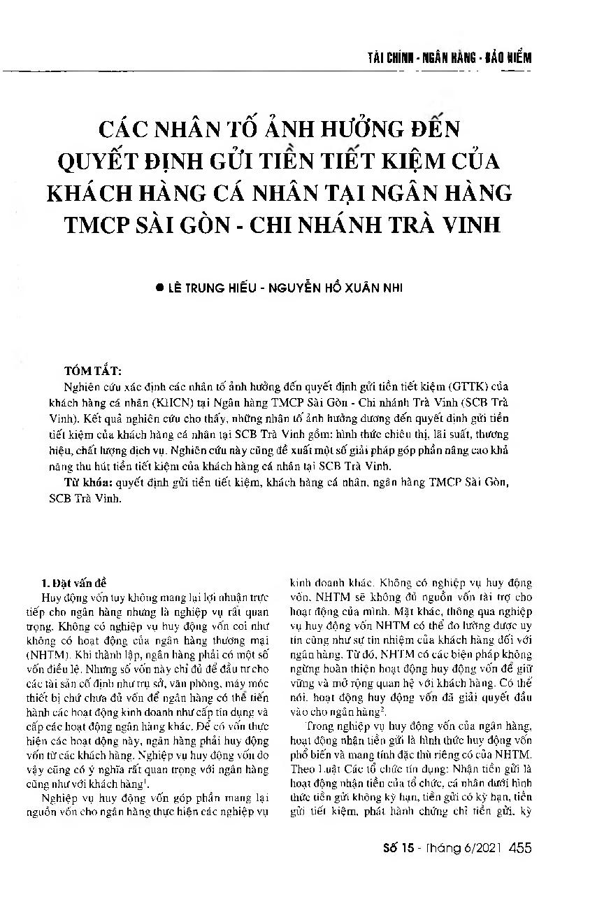 Các nhân tố ảnh hưởng đến quyết định gửi tiền tiết kiệm của khách hàng cá nhân tại Ngân hàng TMCP Sài Gòn - Chi nhánh Trà Vinh = Factors affecting the individual customers' decision to open savings accounts at Saigon Joint stock Commercial Bank - Tra Vinh Branch