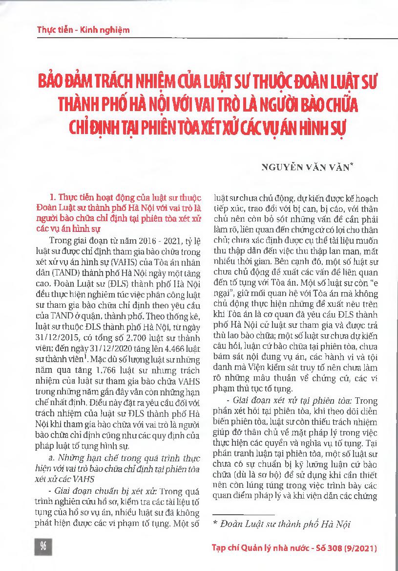 Bảo đảm trách nhiệm của luật sư thuộc đoàn Luật sư thành phố Hà Nội với vai trò là người bào chữa chỉ định tại phiên tòa xét xử các vụ án hình sự