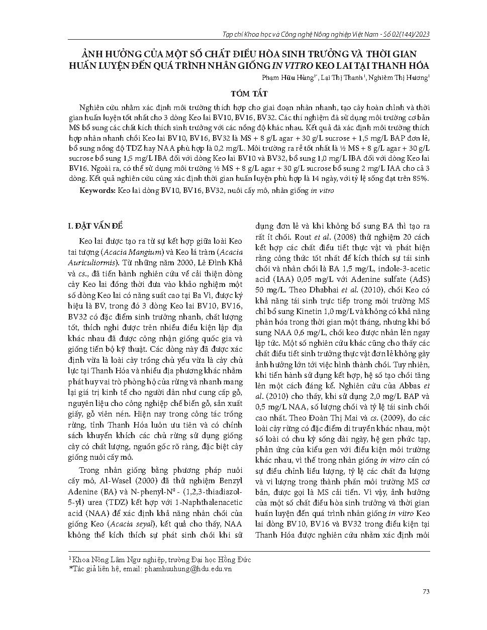 Ảnh hưởng của một số chất điều hòa sinh trưởng và thời gian huấn luyện đến quá trình nhân giống in vitro keo lai tại Thanh Hóa = Effects of growth regulators and training time on in vitro propagation of Acacia hybrid lines in Thanh Hoa