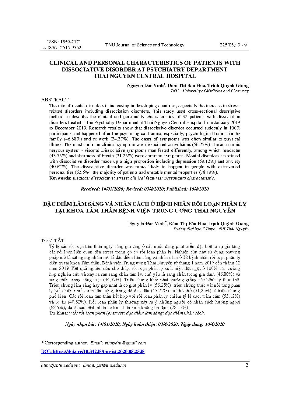 ĐẶC ĐIỂM LÂM SÀNG VÀ NHÂN CÁCH Ở BỆNH NHÂN RỐI LỌAN PHÂN LY TẠI KHOA TÂM THẦN BỆNH VIỆN TRUNG ƯƠNG THÁI NGUYÊN = CLINICAL AND PERSONAL CHARACTERISTICS OF PATIENTS WITH DISSOCIATIVE DISORDER AT PSYCHIATRY DEPARTMENT THAI NGUYEN CENTRAL HOSPITAL