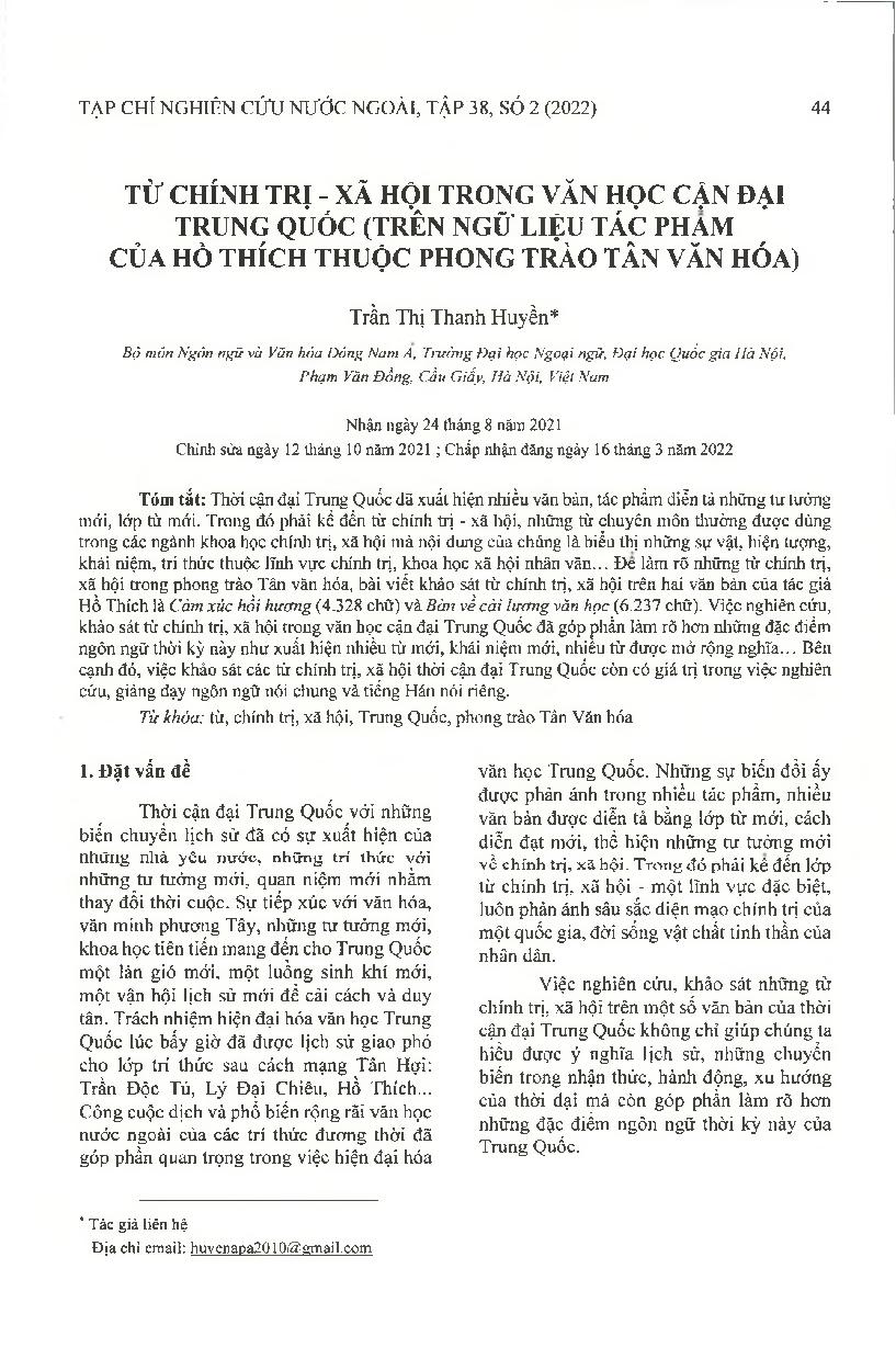 Từ chính trị-xã hội trong văn học cận đại Trung Quốc (trên ngữ liệu tác phẩm của Hồ Thích thuộc phong trào Tân văn hóa) = Socio-Political Vocabulary in Chinese Modem Literature (On the Basis of Hu Shi’s Works in the New Culture Movement)