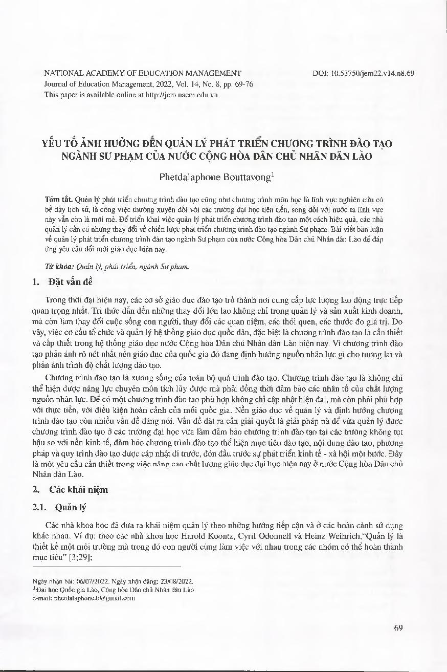 Yếu tố ảnh hưởng đến quản lý phát triển chương trình đào tạo ngành Sư phạm của nước Cộng hòa Dân chủ Nhân dân Lào = Factors affecting the management development of pedagogical curriculum