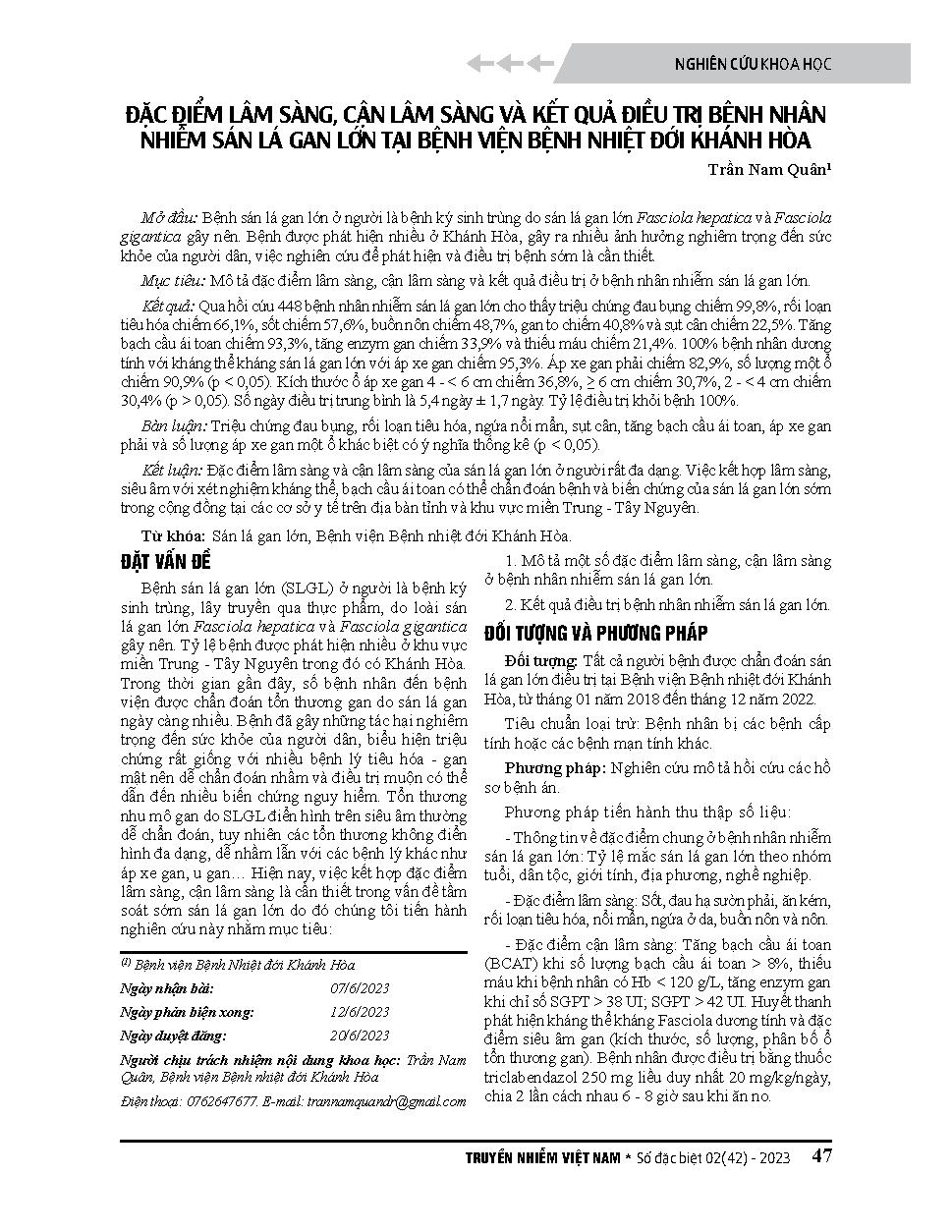 Đặc điểm lâm sàng, cận lâm sàng và kết quả điều trị bệnh nhân nhiễm sán lá gan lớn tại Bệnh viện Bệnh Nhiệt đới Khánh Hòa