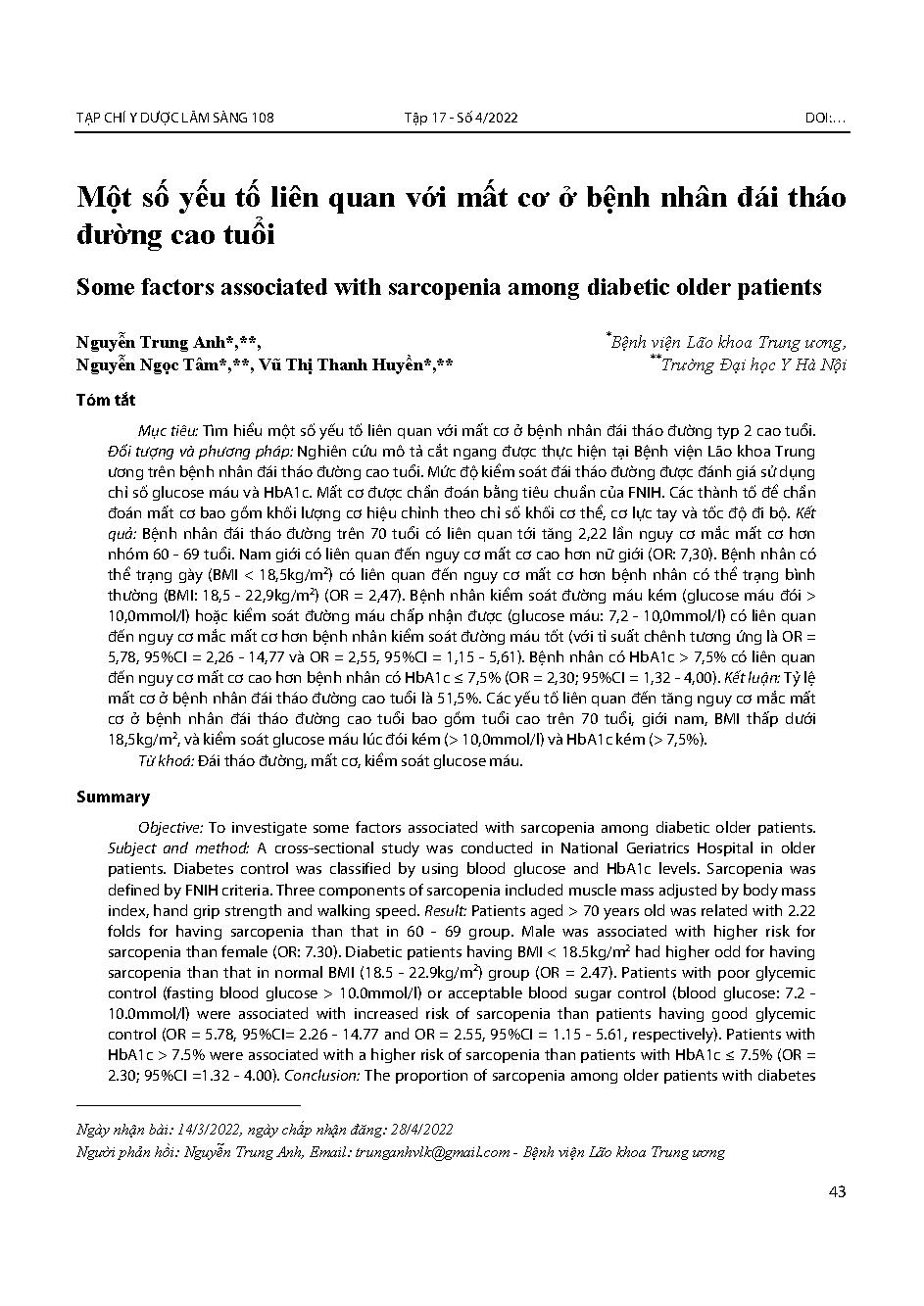 Một số yếu tố liên quan với mất cơ ở bệnh nhân đái tháo đường cao tuổi = Some factors associated with sarcopenia among diabetic older patients