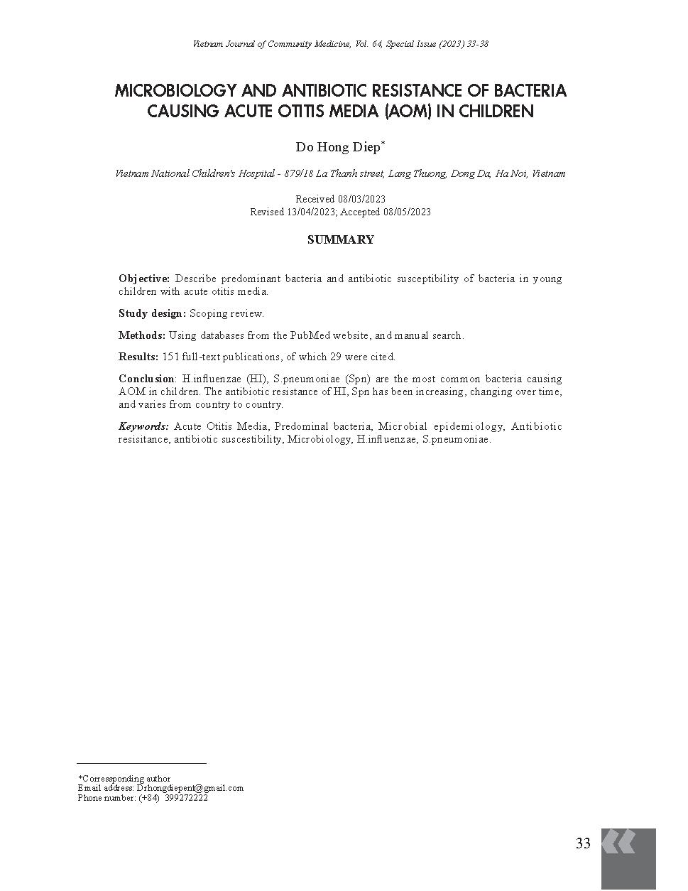 Tổng quan đặc điểm và tính kháng kháng sinh của vi khuẩn gây viêm tai giữa cấp mủ trẻ em = Microbiology and antibiotic resistance of bacteria causing acute otitis media (AOM) in children