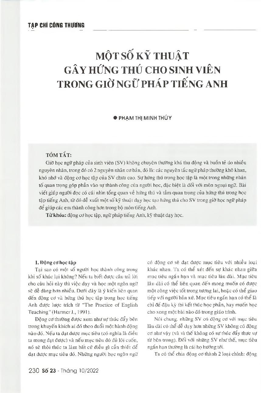 Một số kỹ thuật gây hứng thú cho sinh viên trong giờ ngữ pháp tiếng Anh = Some teaching techniques to generate learning motivation for students during English grammar lessons