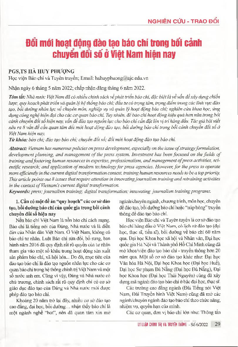 Đổi mới hoạt động đào tạo báo chí trong bối cảnh chuyển đổi số ở Việt Nam hiện nay = Innovating journalism training in the context of digital transformation in Vietnam today