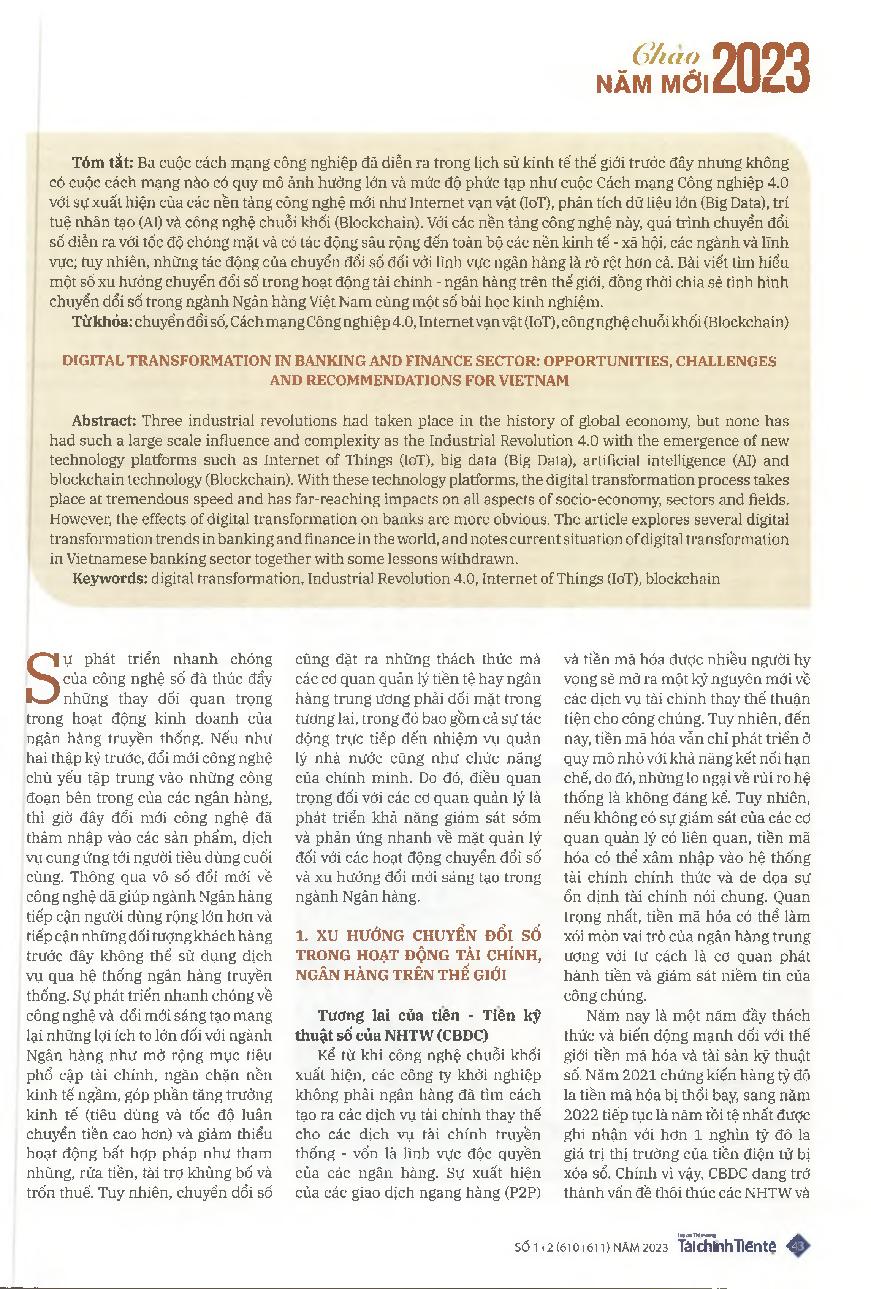 Chuyển đổi số trong lĩnh vực tài chính ngân hàng: Cơ hội, thách thức và khuyến nghị cho Việt Nam = Digital transformation in banking and finance sector: Opportunities, challenges and recommendations for Vietnam