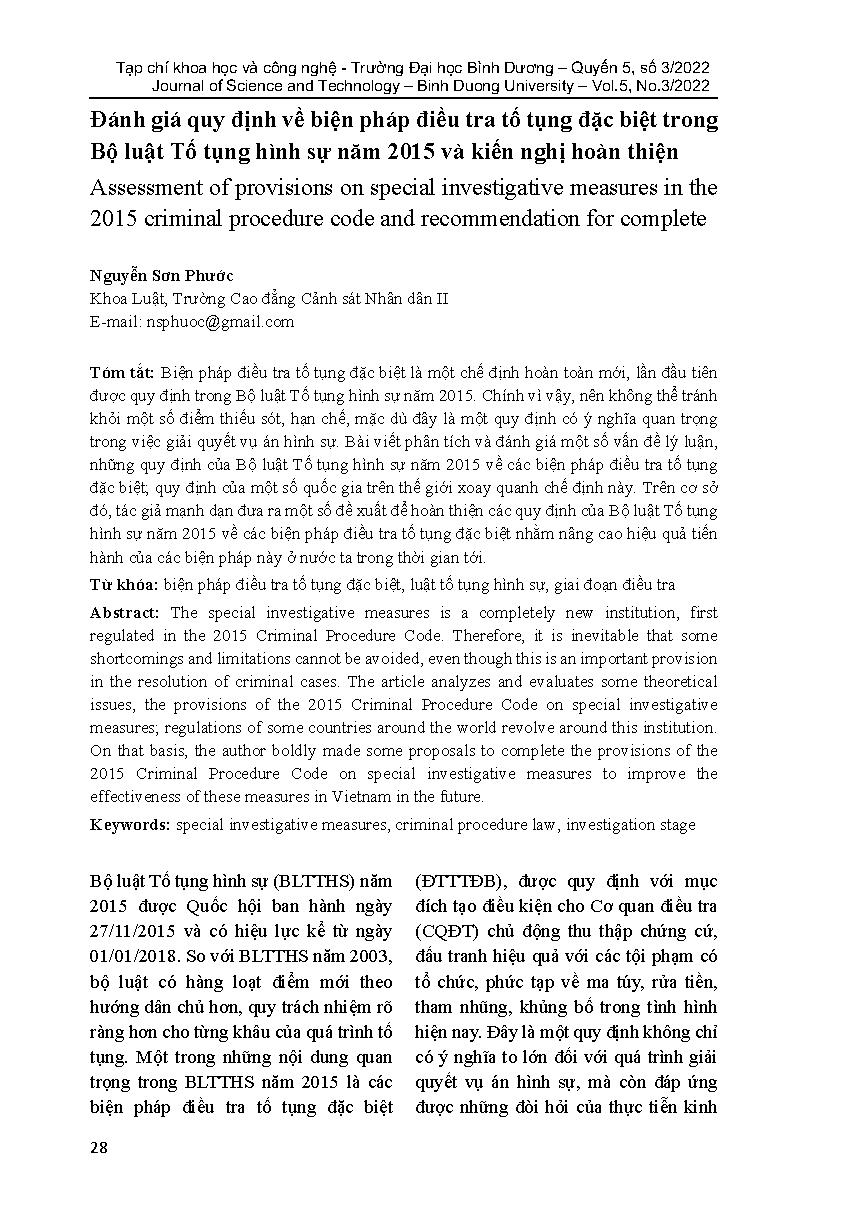 Đánh giá quy định về biện pháp điều tra tố tụng đặc biệt trong Bộ luật Tố tụng hình sự năm 2015 và kiến nghị hoàn thiện = Assessment of provisions on special investigative measures in the 2015 criminal procedure code and recommendation for complete
