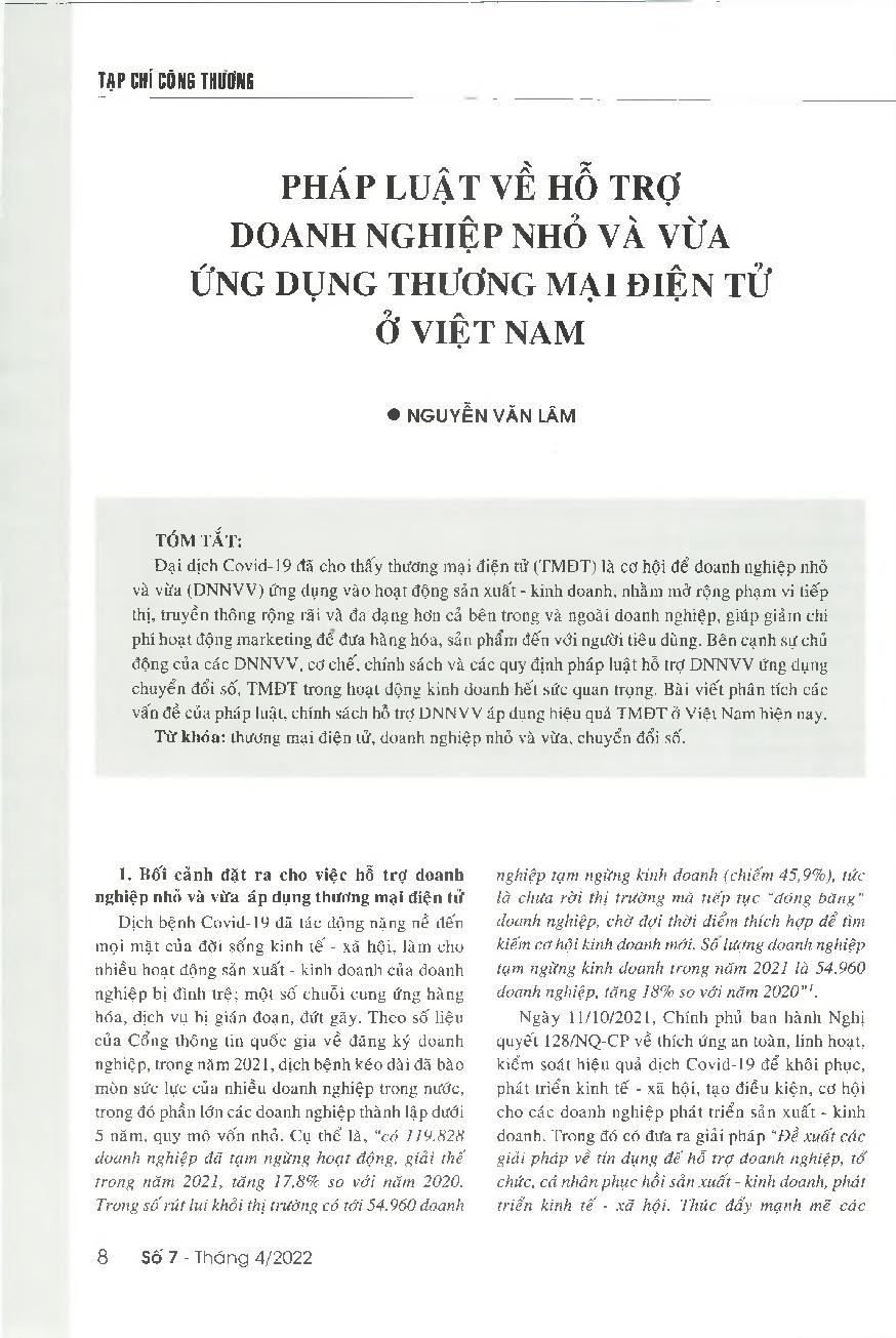 Pháp luật về hỗ trợ doanh nghiệp nhỏ và vừa ứng dụng thương mại điện tử ở Việt Nam = Laws and policies on supporting small and medium-sized enterprises to apply e-commerce in Vietnam