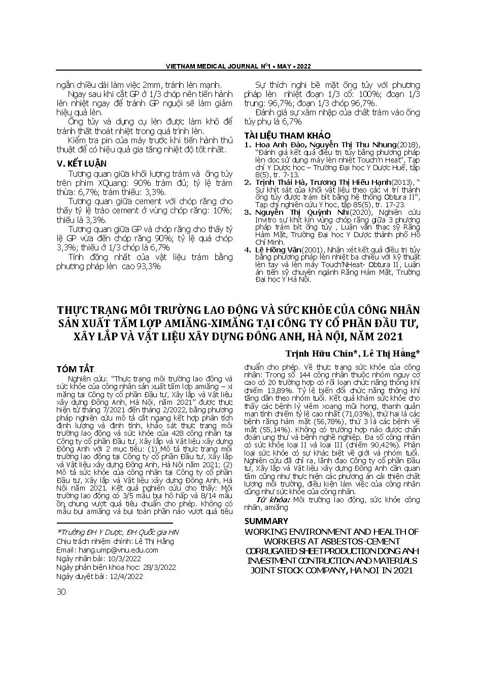Thực trạng môi trường lao động và sức khỏe của công nhân sản xuất tấm lợp amiăng-ximăng tại Công ty cổ phần Đầu tư, Xây lắp và Vật liệu xây dựng Đông Anh, Hà Nội, năm 2021 = Working environment and health of workers at asbestos-cement corrugated sheet pro