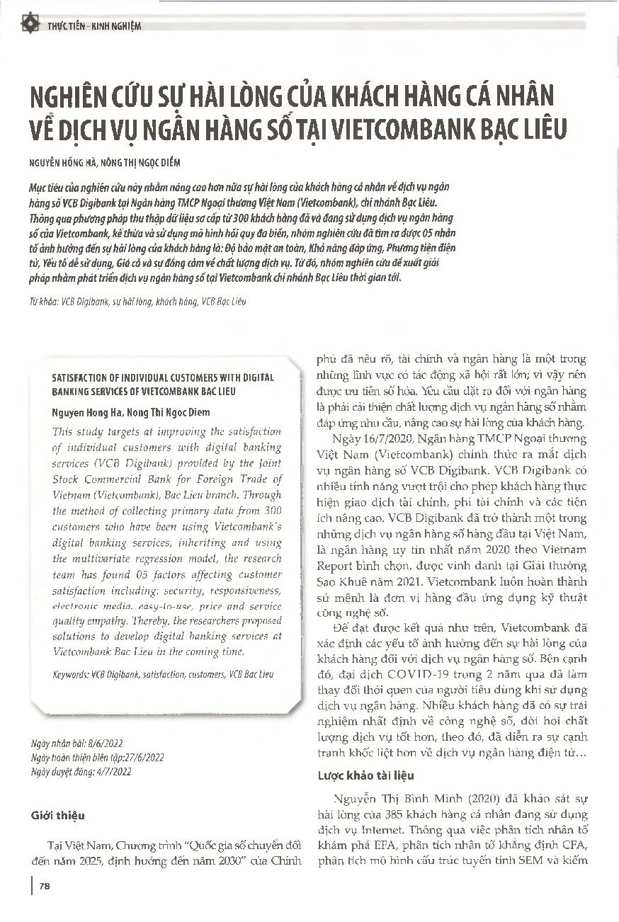 Nghiên cứu sự hài lòng của khách hàng cá nhân về dịch vụ ngân hàng sở tại Vietcombank Bạc Liêu = Satisfaction of individual customers with digital banking services of Vietcombank Bac Lieu