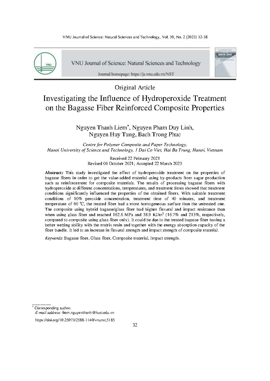 Nghiên cứu ảnh hưởng của xử lý sợi mía bằng hydroperoxit đến tính chất của compozit gia cường bằng sợi mía = Investigating the Influence of Hydroperoxide Treatment on the Bagasse Fiber Reinforced Composite Properties