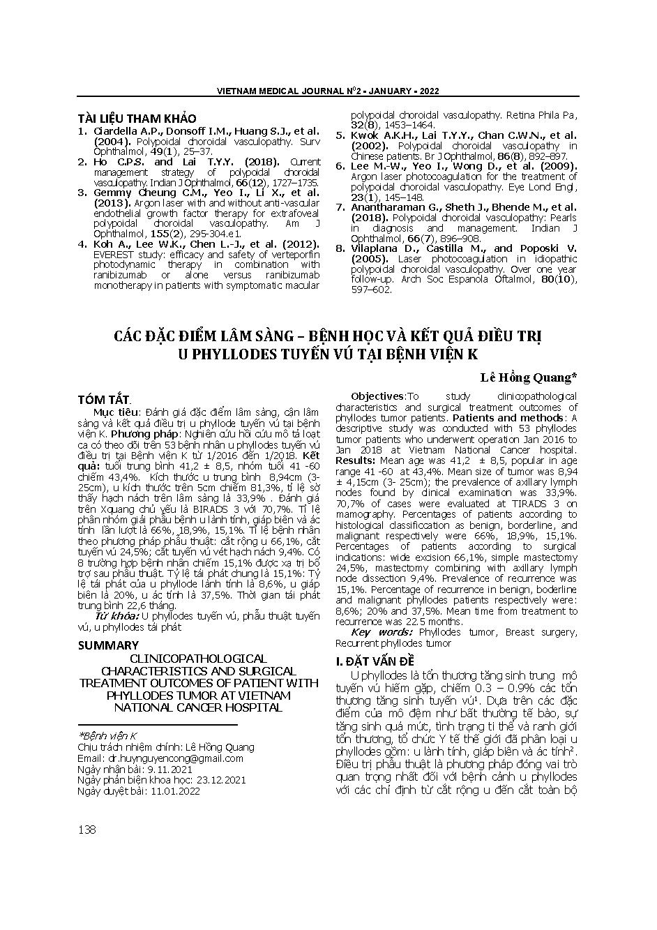 Các đặc điểm lâm sàng – bệnh học và kết quả điều trị u phyllodes tuyến vú tại bệnh viện K = Clinicopathological characteristics and surgical treatment outcomes of patient with phyllodes tumor at Vietnam national cancer hospital