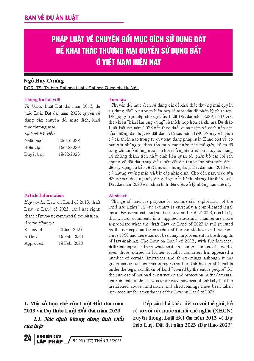 Pháp luật về chuyển đổi mục đích sử dụng đất để khai thác thương mại quyền sử dụng đất ở Việt Nam hiện nay = Law on conversion of land use purposes for commercial exploitation of land use rights in Vietnam today