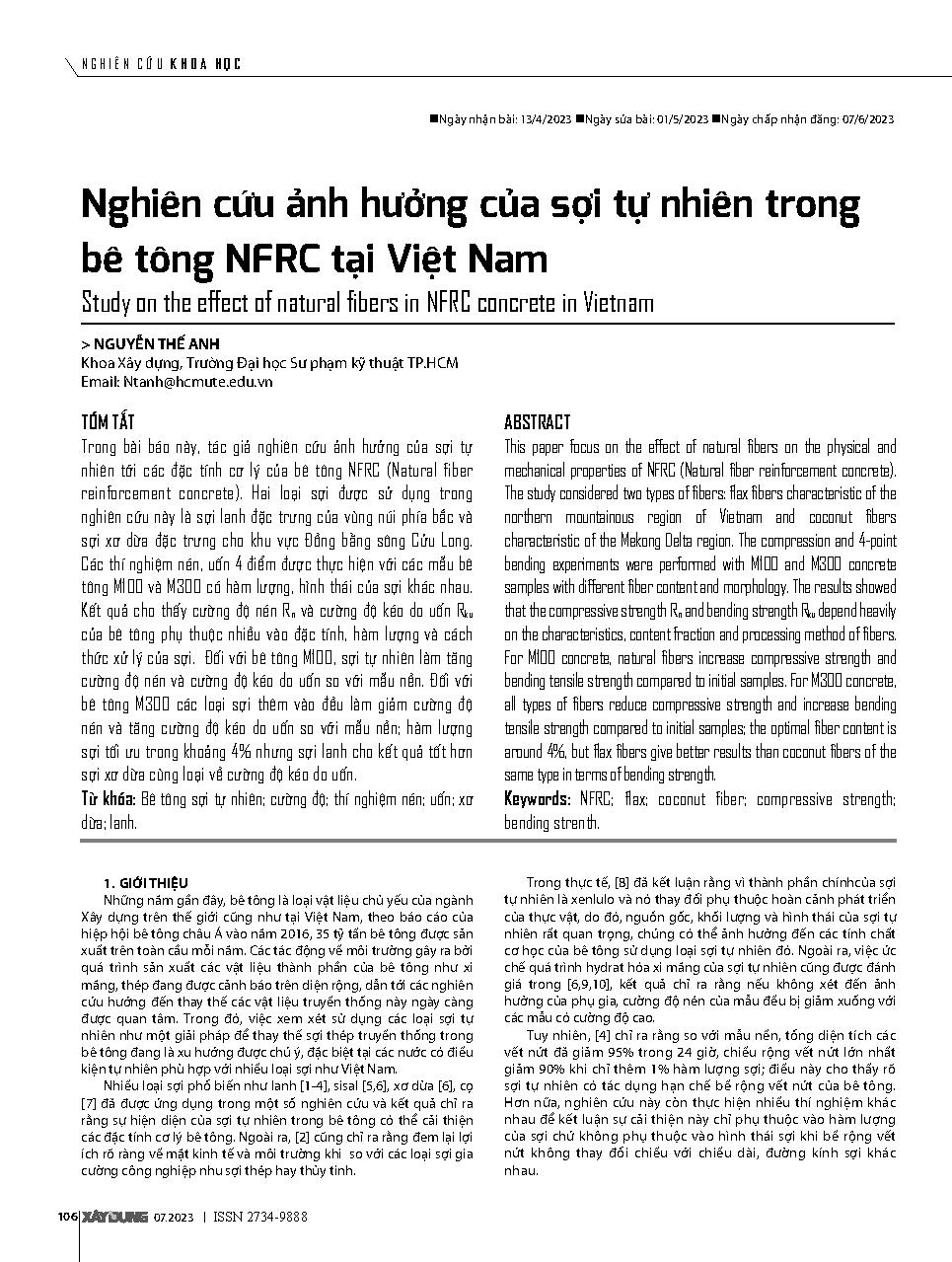 Nghiên cứu ảnh hưởng của sợi tự nhiên trong bê tông NFRC tại Việt Nam = Study on the effect of natural fibers in NFRC concrete in Vietnam